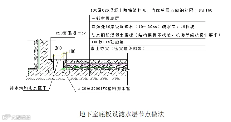 做法说明:当项目地下水位较低,地下室底板防水混凝土厚度大于500mm,底板取消外防水审图机构及验收可以通过时,可采用设滤水层取消底板外防水的做法。