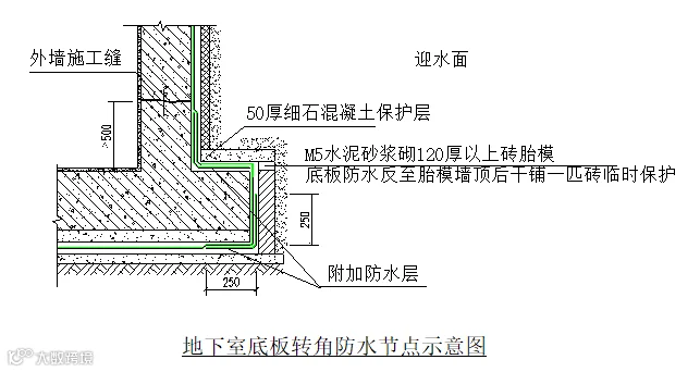 做法说明:地下室底板转角位置受作业空间、防水需留预接长度、要对防水接头实施保护等影响因素多,为此须重视此转角部位的防水做法。
