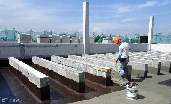 防水卷材施工前,清理好基层表面,用长把滚刷均匀涂布与防水材料匹配的基层处理剂,常温经过4小时后,开始铺贴不小于3mm厚SBS改性沥青防水卷材。防水层高度不低于种植土完成面400mm。