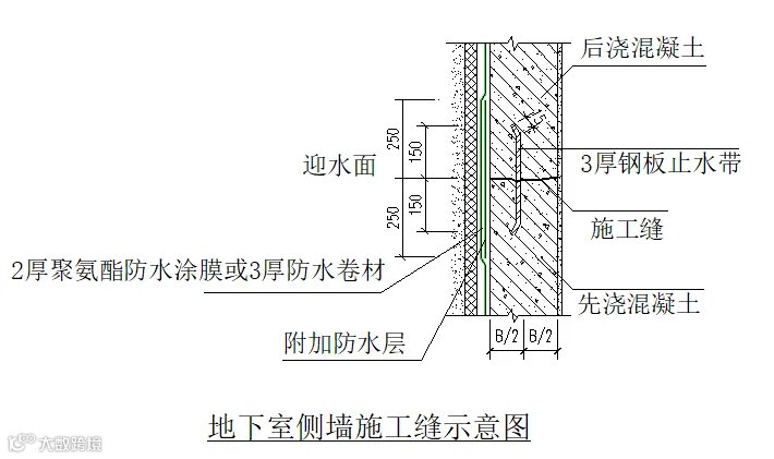 工艺流程:地下室外墙施工缝清理——后浇混凝土——防水附加层——防水层——保护层