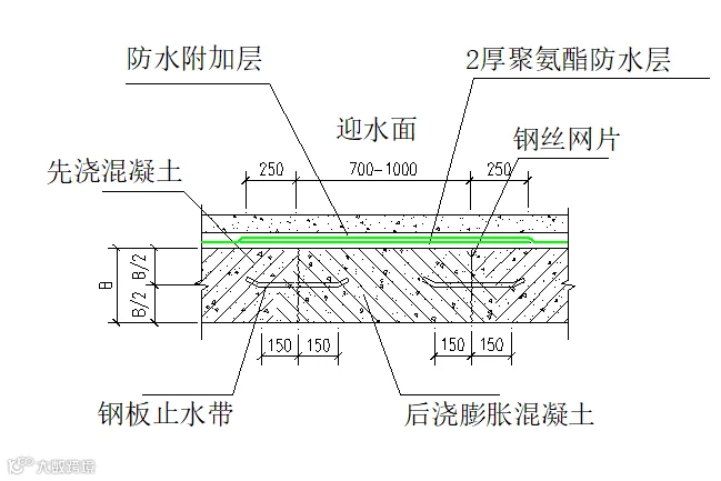 后浇带位置施工完防水附加层,经验收合格后再施工防水层。在后浇带两侧设3mm厚300mm宽止水钢板。不同块钢板连接必须满焊。钢板U型口朝向迎水面。止水钢板上下安装好钢丝网片。底板混凝土浇筑前要对后浇带止水钢板进行隐蔽验收。