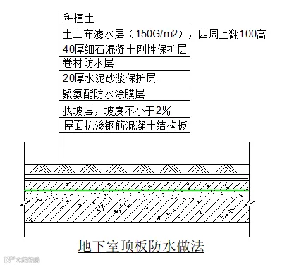 工艺流程:钢筋混凝土自防水结构顶板——找平层/找坡层——聚氨酯防水层——闭水试验——防水保护层——卷材防水层——刚性保护层——滤水层——种植土