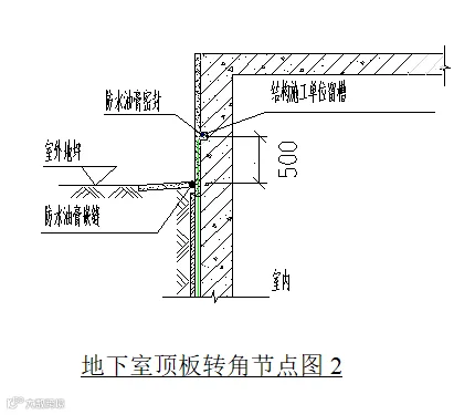 做法说明:当地下室板顶与室外地坪高差在1米以内时,采用图1节点在转角处施工防水附加层后,在外墙与顶板处满做防水层。当地下室板顶高于室外地坪1米以上时,可按图2做法在外墙结构处留槽,将防水层在槽内收口。