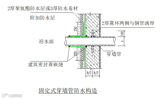 做法说明:结构变形或管道伸缩量较小时,穿墙管可采用主管直接埋入混凝土内的固定防水做法,主管应加焊止水环,并应在迎水面预留20深、30宽凹槽,凹槽内采用油膏密封材料嵌填密实。穿墙管应在浇筑墙体混凝土时预埋。穿墙管与内墙角、凹凸部位的距离应大于250mm。相邻穿墙管间的间距应大于300 mm。
