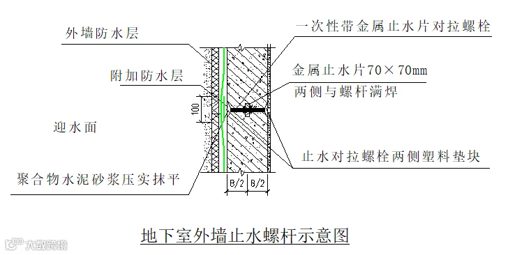 做法说明:地下室外墙用于固定模板的螺栓必须采用一次性止水对拉螺杆。一次性止水对拉螺杆可采用工具式螺栓或螺栓加塑料堵头方式使螺杆端头留出凹槽。螺栓上应加焊2厚70×70mm止水片。当一次性穿墙螺杆两端采用锥形塑料垫块时,养护结束后需在墙体内外逐个剔除塑料垫块,然后将螺杆从孔口的最深处割断。在施工防水层前,应逐个将螺杆位置处的凹槽用1:2聚合物水泥砂浆压实抹平。