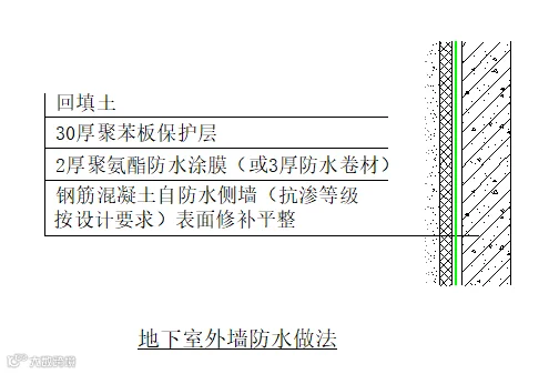 做法说明:适用地下室外墙内侧为室内(如私家住宅、车库、功能房、架空活动区)的外墙防水做法。
