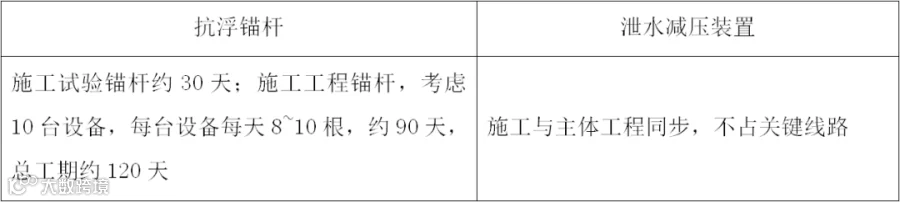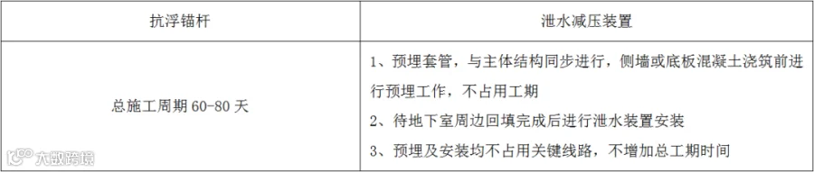 抗浮锚杆施工在工程计划网络图中属于关键路线,本项目该工程施工计划工期约60-80日历天,而“泄水减压法”方案属于非关键路线,主要跟随主体结构施工时预埋孔洞以及后期安装抗浮泄水装置,对总工期不会造成影响。相较两种抗浮方案,“泄水减压法”抗浮方案可大大缩短工程建设总工期。