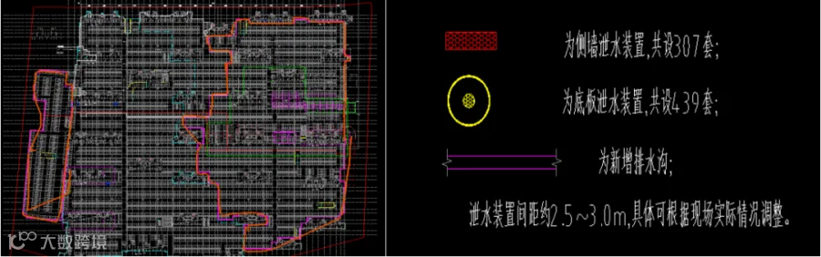 甲方通过邀请具备相关设计、施工“泄水减压法”抗浮方案资质的单位实地考察项目土方开挖后土质情况,并结合前期地质详勘报告,提供了满足设计要求的“泄水减压法”抗浮方案,具体方案为(侧墙泄水装置307套,底板泄水装置439套,对应新增土建排水沟)
