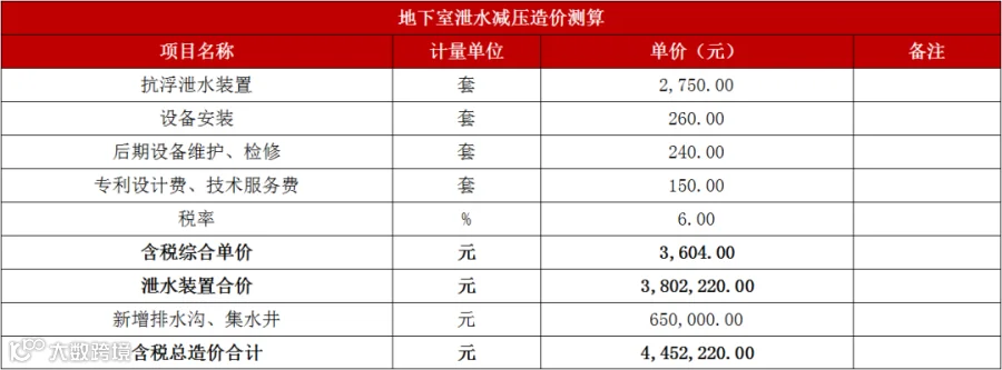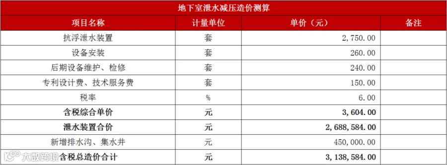 经过询价武汉某项目,本方案泄水减压装置按每套3600元计算,测算总价为313万元,具体明细如下:(含拟采用新型泄水减压装置后期相应增加的土建排水沟及集水井);