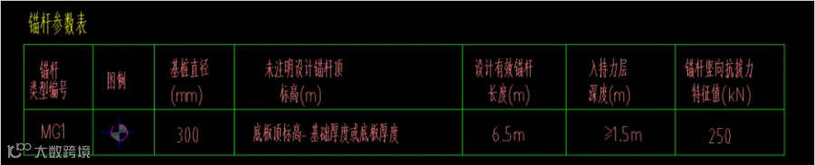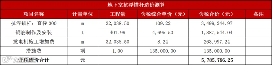 项目前期提供方案为抗浮锚杆,具体方案为:直径300mm抗浮锚杆共计4929根,设计有效锚杆长度6.5米,竖向抗拔力特征值250KN。