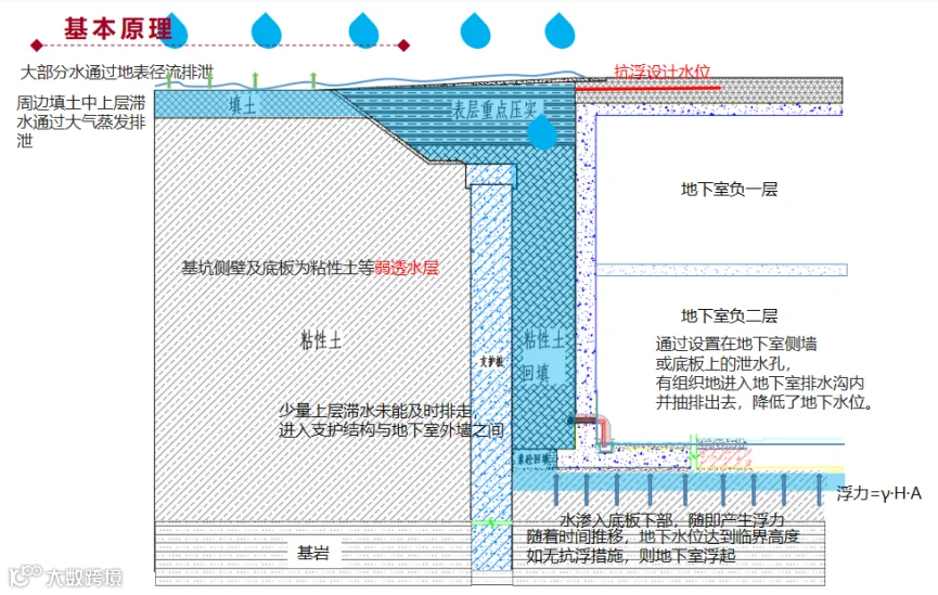 地下室开挖后,应考虑上层滞水对地下室的浮力作用,抗浮设计水位按室外地面设计标高考虑,依据设计规范要求,纯地下室部分需进行抗浮处理。
