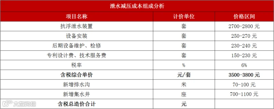 泄水减压为垄断性专利工程,常规项目一般为业主通过调研其他地产项目价格,直接同施工单位约谈定价,需注意谈定的价格对于后期设备维护、检修等费用是否包干。随着房地产大环境变化,控制开发成本,加快开发节奏,“泄水减压法”方案逐渐被运用在一些房建项目。