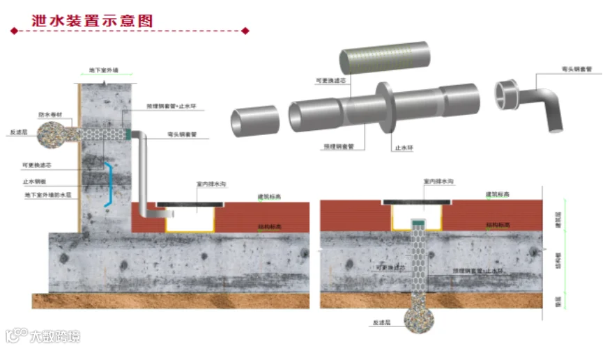③施工工艺:预埋套管,与主体结构同步进行,侧墙或底板混凝土浇筑前进行预埋工作,待地下室周边回填完成后进行泄水装置安装。