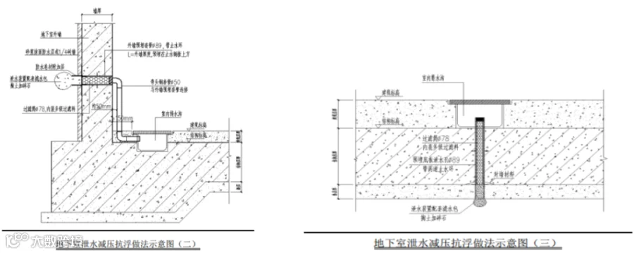 ②抗浮原理:一种内外结合的抗浮方法,让地下水通过地下建筑物侧墙或底板上设置的泄水孔,有组织的进入地下室内排水系统,结合已有排水系统,抽排地下水,降低室外地下水位,减小对结构上浮的压力。
