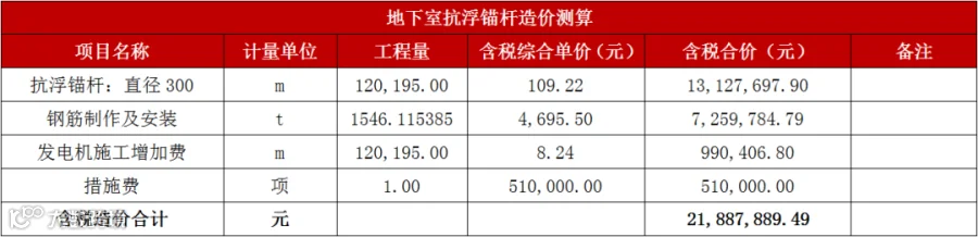 说明:桩长按设计方案15m计算,价格参照其他项目,测算含税总造价为2188.79万元。