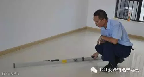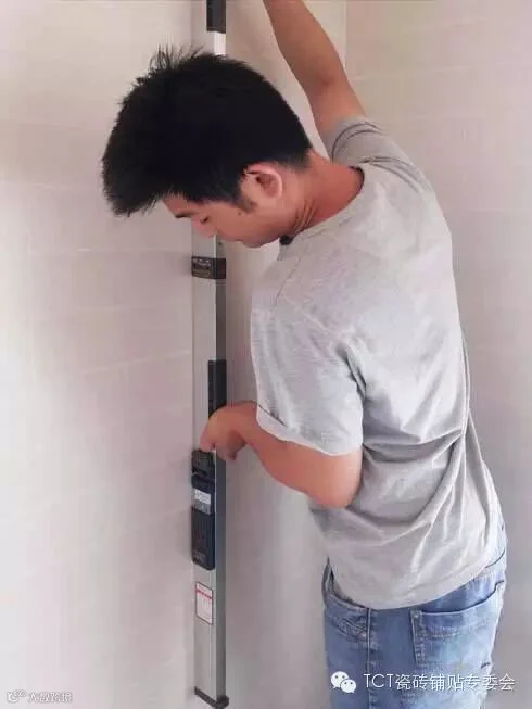 用大靠尺在贴好的瓷砖表面靠,允许误差3mm。