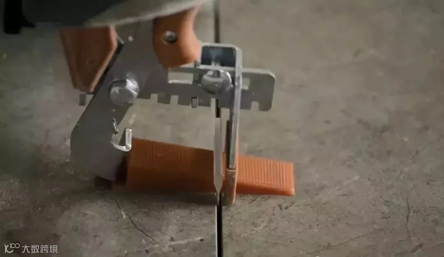 在已定位好的四边插入找平器底座,夹紧找平器,以保证铺贴后的平整度。