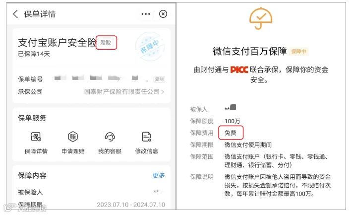 当用户注册使用微信支付、支付宝时,将自动免费开启“百万保障”,此保障为APP自带安全设置,完全免费,不会“到期”或者“过期”,不会要求“缴费续保”,更不会影响征信。