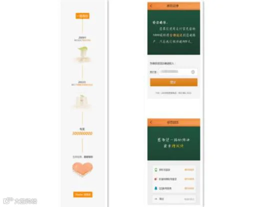 如之前我用过的一个阅读app应用,做了一次“一路有你,感恩回馈”的活动,主要的目的是为了让在app有资产的用户填写自己的支付宝账号。为了让用户更容易接受,他们把活动页面设计成如下图所示:前面设计成app五年用户增长路程,并表示对用户的感谢,最后才把占据用户视觉主要位置的UI设计成活动内容和参与方式。