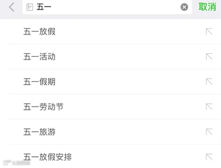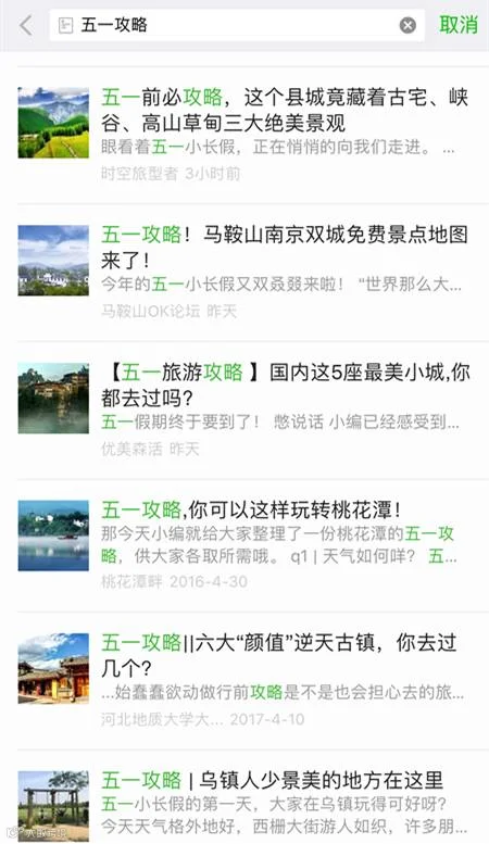 上图,便是我在微信直接搜“五一”所跳出的相关关键词。毫无疑问,这几类应该就是关于“五一”这个话题的主流文章类型了。