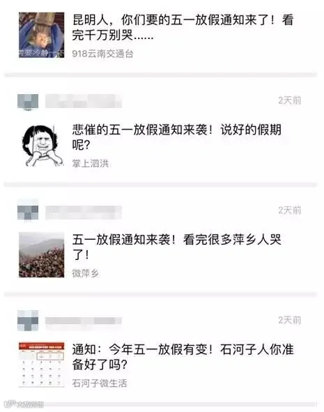 今年的与众不同,均源于这次的5.1是周一,和上周的周六和周日组成了“三天小长假”。给了我们一种“寻常周末的”感觉,也给这类标题党提供了原生的土壤。
