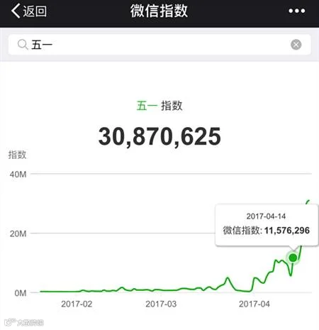 从微信指数,我们可以明显的看到四月初“五一”一词的指数便开始增长,而4.14更是一个显著的转折点,“五一”从此刻引爆,指数急剧上升。显而易见,这是运营ers开始发力了。