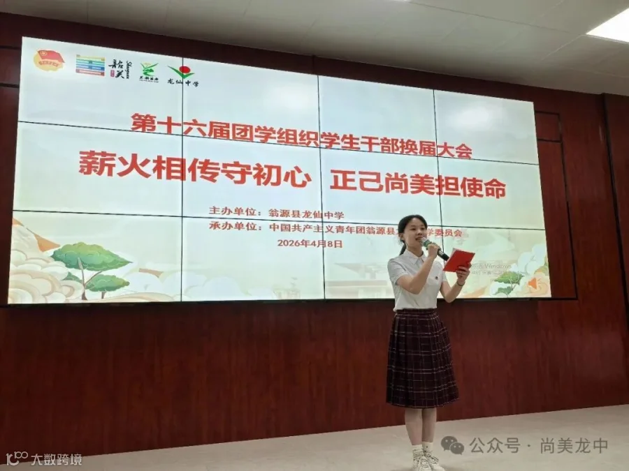 青春接力,使命传承。为了进一步加强团学组织建设,传承“薪火相传守初心、正己尚美担使命”的精神,推动学校正己德育与尚美教育理念的落实,健全学生干部的培养机制,翁源县龙仙中学于2026年4月8日在阶梯教室隆重举行了第十六届团学组织学生干部换届大会,众多师生齐聚一堂,共同见证这一重要时刻。
