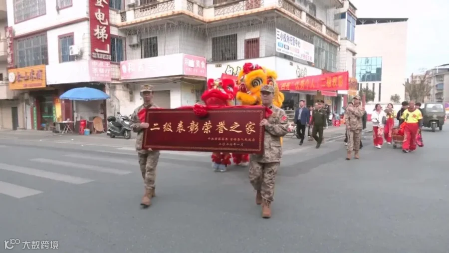 送喜报现场锣鼓喧天,舞狮开道,报喜团高举横幅和荣誉牌匾,手捧立功喜报和慰问金,迈着整齐的步伐向功臣家中走去。沿途群众纷纷驻足观看,共同见证这一荣光时刻。