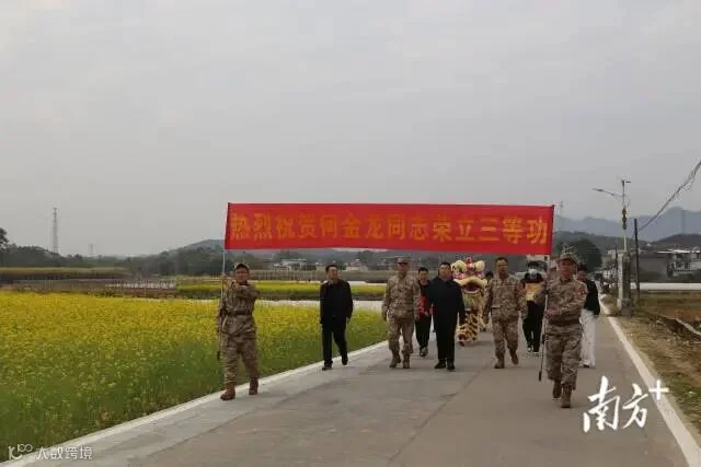 新江镇小镇村内锣鼓喧天、醒狮欢腾,一派喜庆气象。翁源县人民武装部、县退役军人事务局与新江镇人民政府共同组成的送喜报队伍,高举“热烈祝贺荣立三等功”的横幅,穿行于村道之中。鞭炮声声,映衬着村民们的笑脸与掌声,庄严而热烈的仪式,让整个村庄都沉浸在“一人立功、全村光荣”的浓厚氛围里。