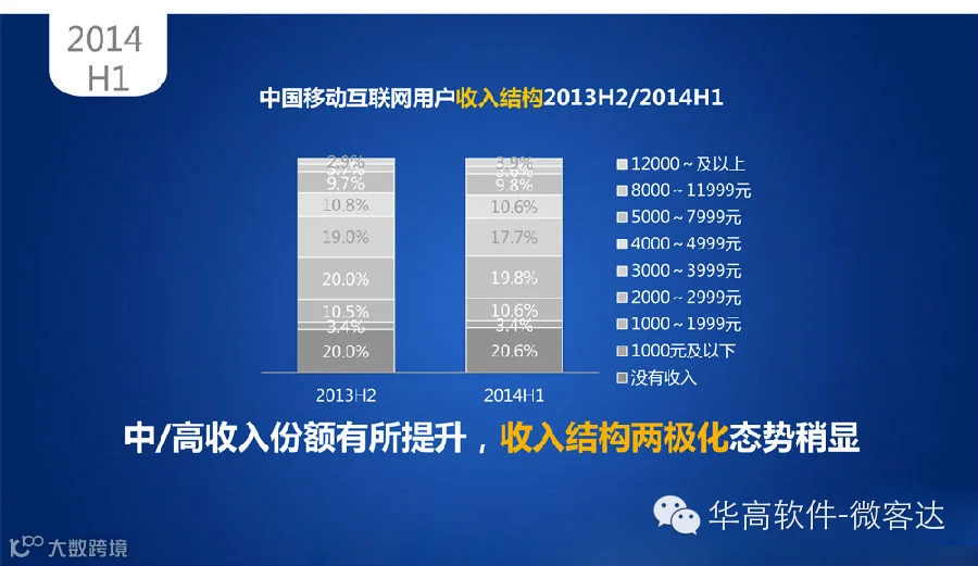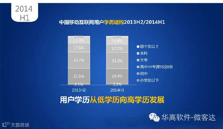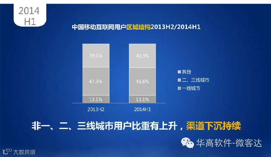 调研数据显示,移动互联网用户中二、三线城市人口占比超过五成。城市移动互联网渗透率相对较高。运营商基础建设从城市转向农村,通过硬件设施改善、三大运营商的重视、移动终端价格的不断调低,乡镇会成为移动互联网用户另一个有力增长点。