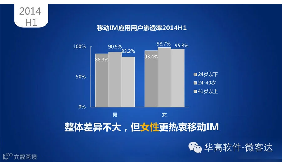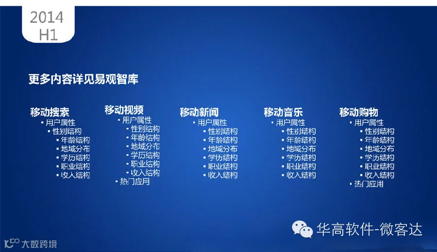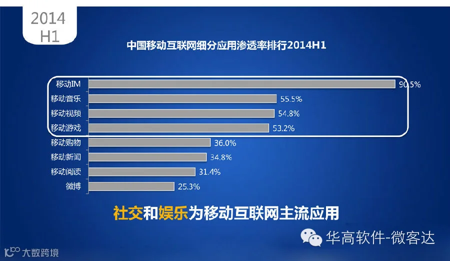 移动IM在中国移动互联网用户中的覆盖比例仍居榜首。紧随其后的移动音乐、移动视频、移动单机游戏的用户覆盖紧跟其后。移动互联网用户使用重点依旧围绕在社交、音乐、视频、游戏四大娱乐领域。而购物、地图等需求紧随其后。易观智库分析认为,移动互联网工具类、商务类需求呈现明显的渗透趋势,即购物、道路查询、搜索等需求以功能的形式嵌入到娱乐类应用之中,这也迎合了移动互联网APP切换成本高的特点,各移动互联网企业为便于用户使用,以此种方式降低用户应用转换的时间成本。在这一特点及趋势的带动下,未来超级APP、平台APP的量级将不断提升,工具类、商务类应用的功能属性将更加明显。