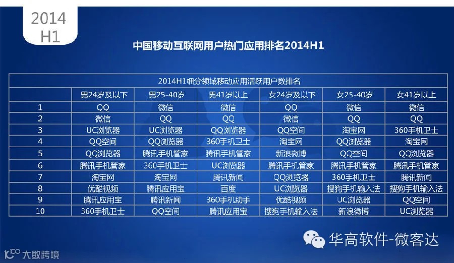 数据显示,移动互联网用户在区域上的差异微微显露出来,在一线城市微信成为女性用户的首选应用,而在二、三线城市QQ则是女性应用的首选;在一线城市,男性用户中移动应用top10当中并没有购物类的APP,而在二、三线城市,淘宝网进入了男性用户使用APP的top10中。在年龄结构中,一线城市24岁以下的移动互联网用户中,移动视频类APP进入热门APP的top10排名之列,而在二、三线城市中24岁以下的移动互联网用户中,热门应用的top10之中并没有出现视频类的APP。