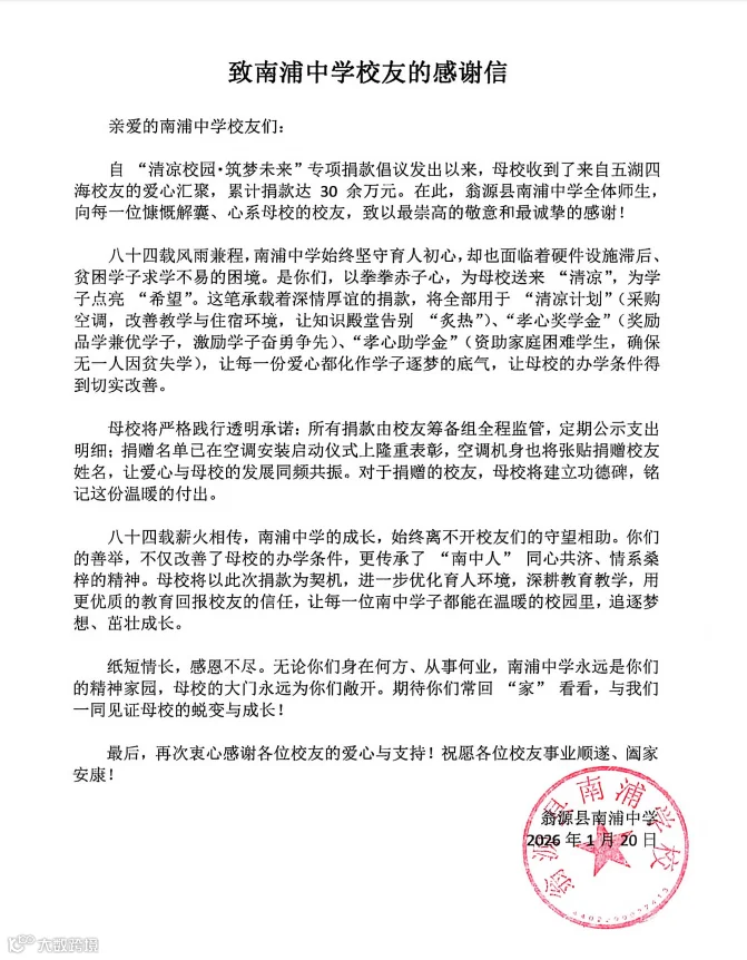 致南浦中学校友的感谢信