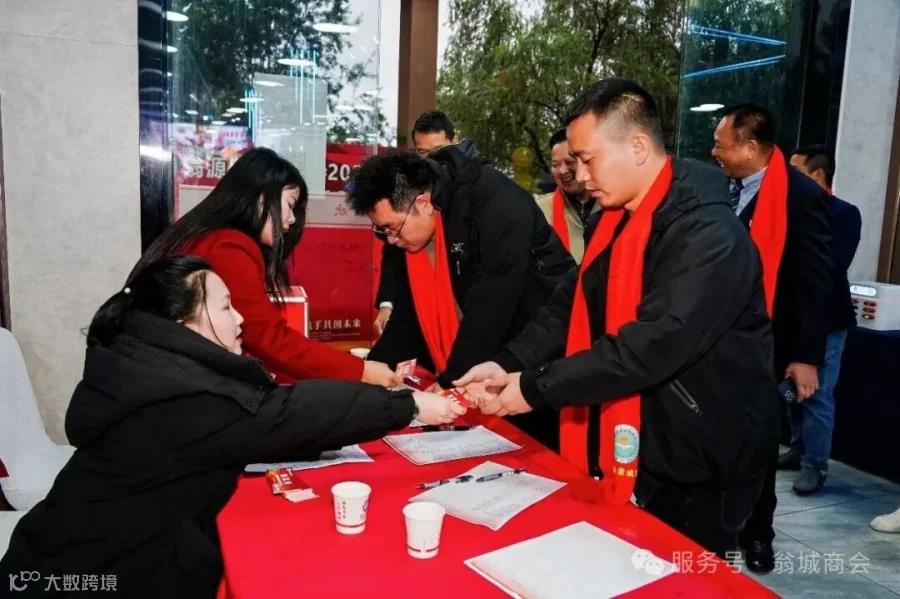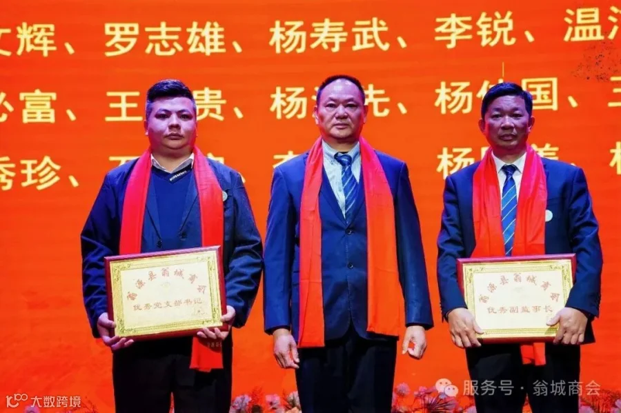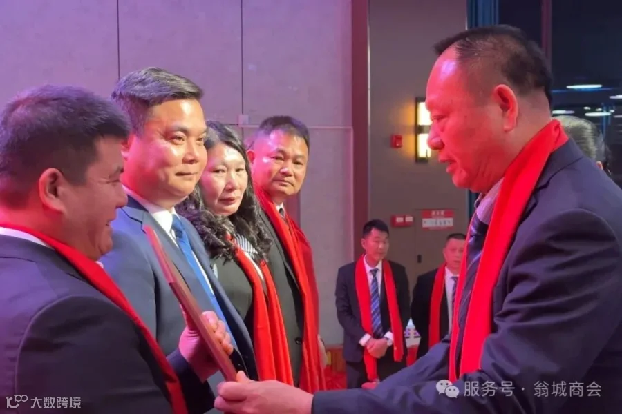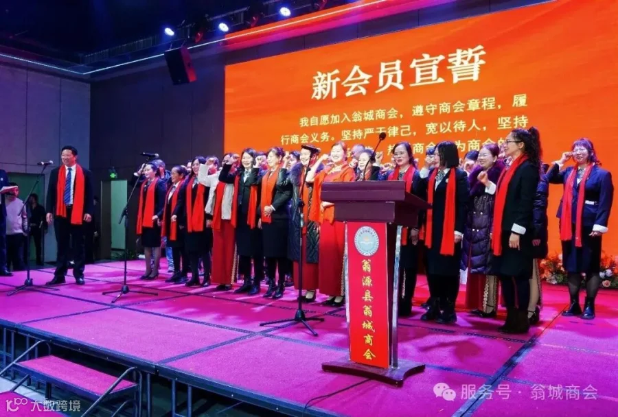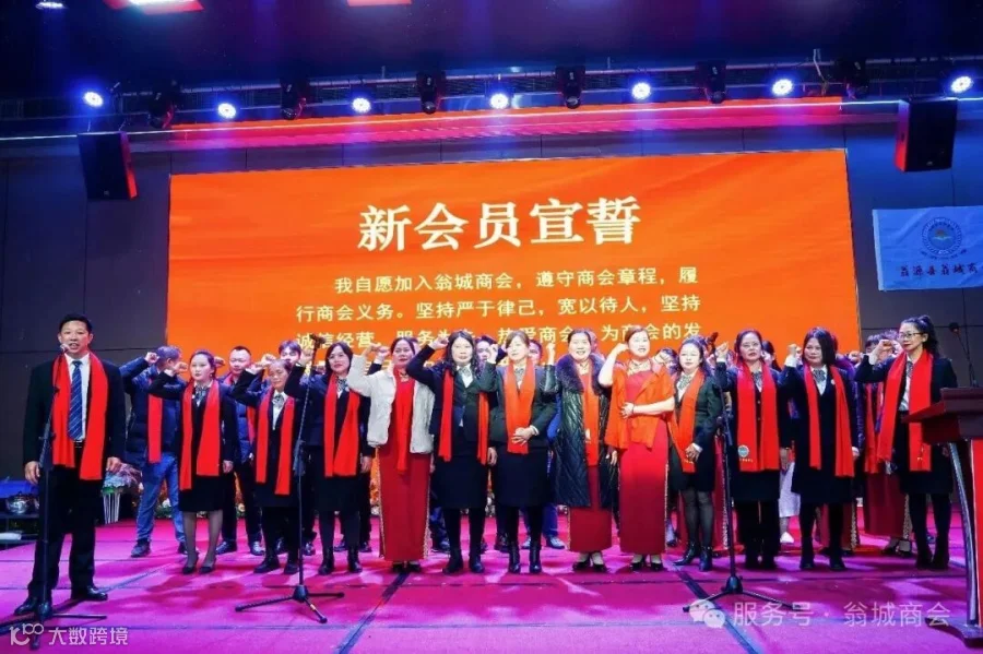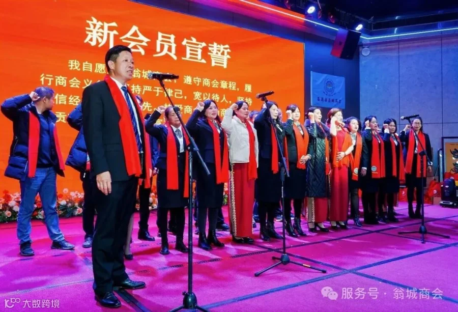 2025年商会吸纳了一批新会员加入翁城商会大家庭。39名翁城商会新会员上台,紧握右手、高举过肩,面向商会会旗,跟随监事长杨文辉,庄严宣誓自愿加入翁城商会,遵守商会章程,履行商会义务,坚持诚信经营,为商会的发展贡献自己的力量。会长何群辉、党支部书记李芳林、监事长杨文辉为他们颁发会员牌匾。
