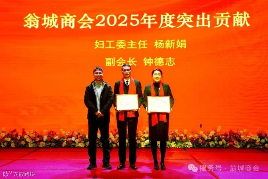 在2025年商会建设与发展中,有两位同志挺身而出、勇挑重担,为商会各项工作落地作出了不可替代的贡献,获评2025年度突出贡献奖。翁城镇党委副书记、镇长邝振书为获评突出贡献的妇工委主任杨新娟、副会长钟德志两位同志授牌。
