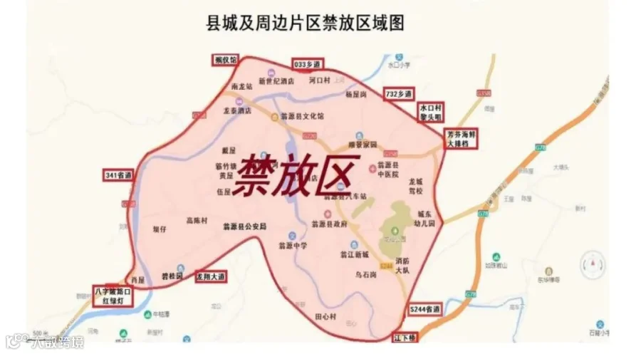 (一)县城及周边区域。县城城区及周边农村,东至马山村傅屋组芳芬海鲜大排档,南至田心村江下桥(包含田心村),西至龙翔大道群陂村八字陂路口红绿灯(包含八字陂肖屋组),北至翁源县殡仪馆。