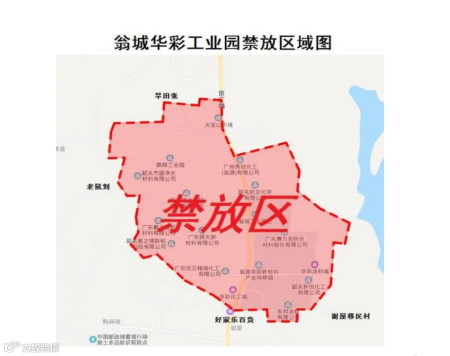 (二)翁城华彩工业园区域。华彩园区边界外200米范围内,东至泉坑村委谢屋村小组,南至富陂村委18、19、20村小组,西至富陂村委15、16 、17村小组,北至新江镇新展村委旱田张村小组。