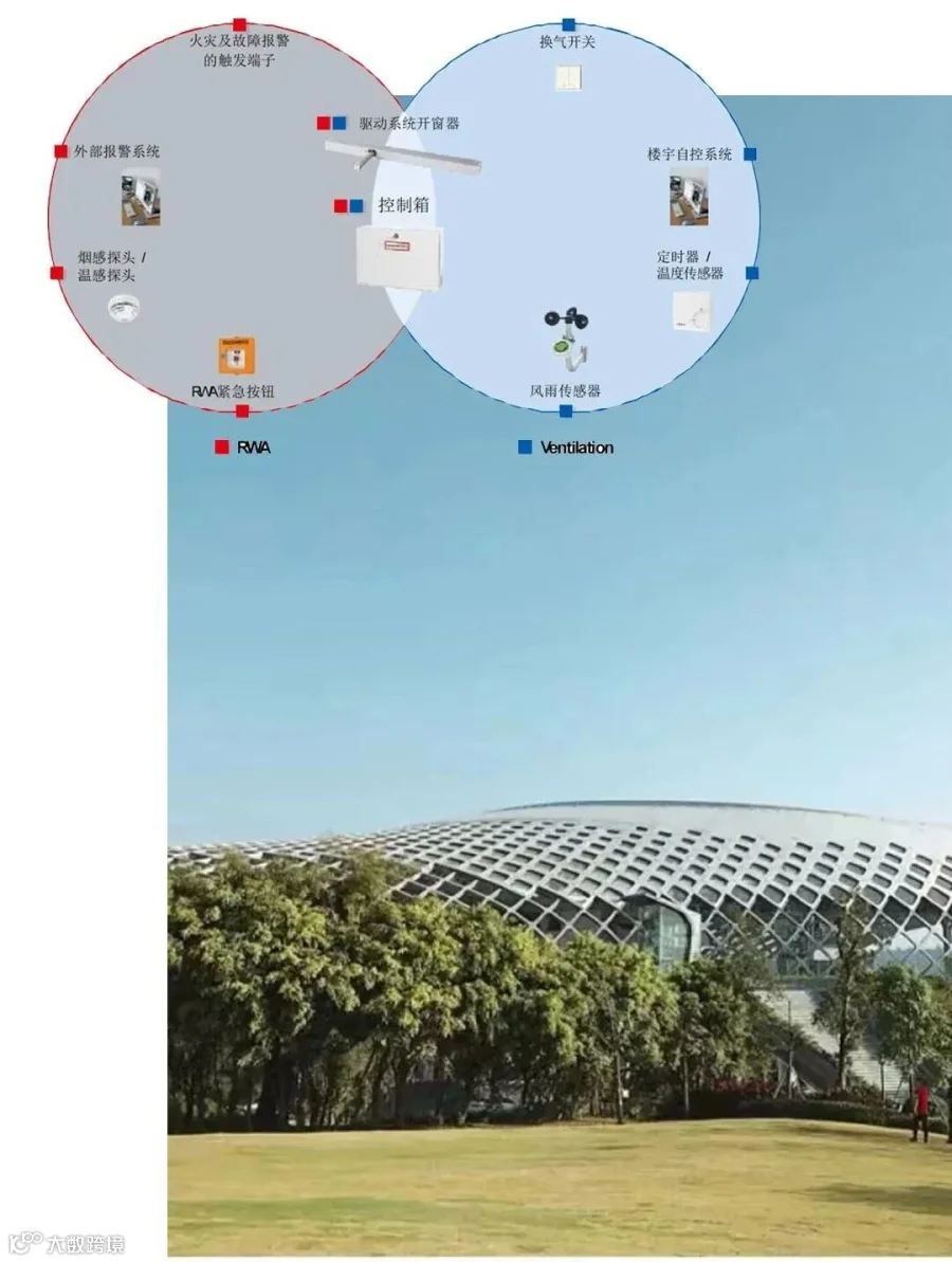 由于有众多的通口,这里自然通风会非常好,但体育中心本身也有很多室内的场馆,对于运动和大量的流动人群来说,室内场馆的通风和安全尤为关键——德国格屋提供了RWA自动排烟排热通风系统解决方案。