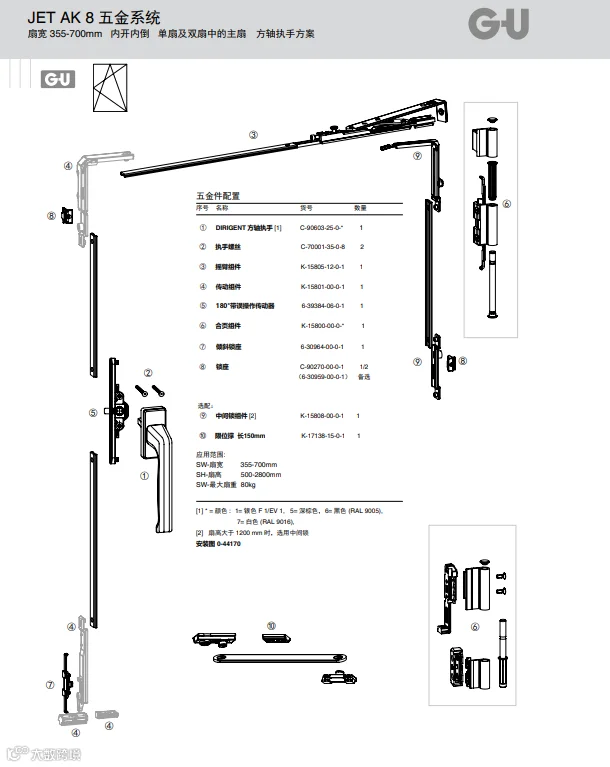 德国格屋的平开窗配件,有方轴执手方案和拨叉执手方案,均适用于带标准欧标槽 15/20mm 的铝合金型材。