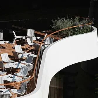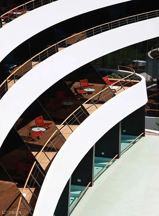 建筑的每一层呈渐缩式上升,从各个角度都能看到一个锥形化的立面。高度呈现动态变化的复杂露台使得所有楼层的公共区域和客房动态交织分布,由此形成了整个内部布局。