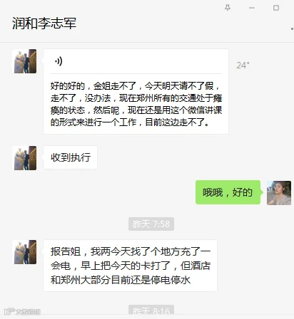 身处郑州的李志军老师和钟晨光老师每天坚持巡店,在汛情最严峻的时候,选择跟市场小伙伴们在一起,晚上回来之后,找地方把手机和电脑充满电,爬上11楼回酒店继续和店面沟通下一阶段工作……