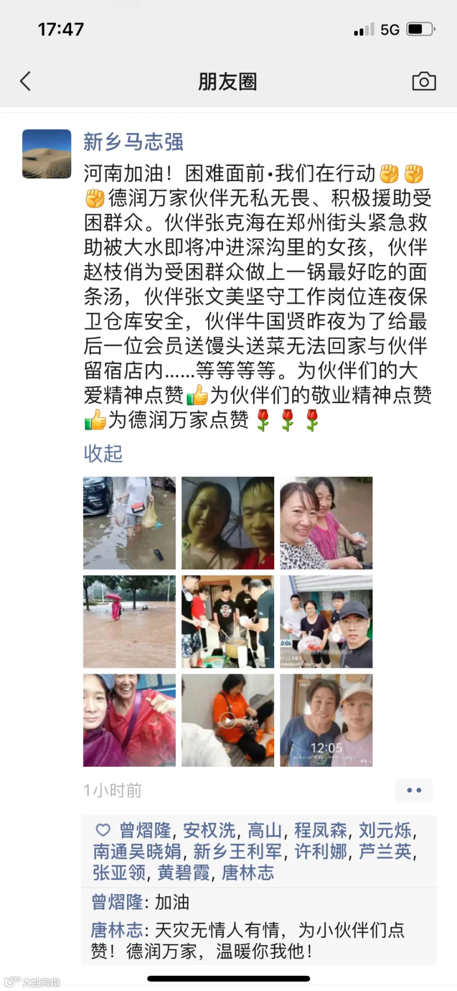 而我们的合作伙伴——河南德润万家团队,更有小伙伴紧急救助被大水冲进水沟的女孩,有小伙伴为受困群众奉上美味的面汤,有小伙伴坚守仓库保卫仓库安全、有小伙伴为给会员送食物甘愿被困店内……