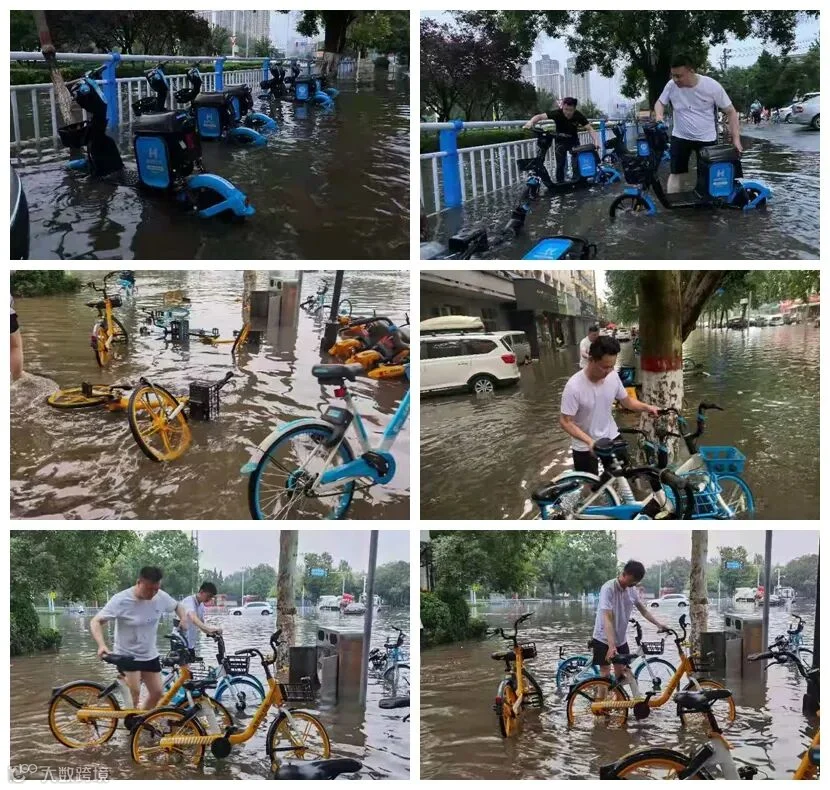 暴雨之后路面积水更严重,洪水将街道冲刷得一片狼藉。余亮、韩鹏、邱彦瑚、安瑞奇、李明慧、刘艳桢等小伙伴,在杨先标总监的带领下,积极整理共享单车,及时清理路面障碍物,消除潜在的水下安全隐患。