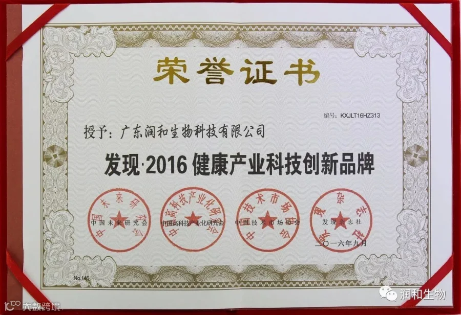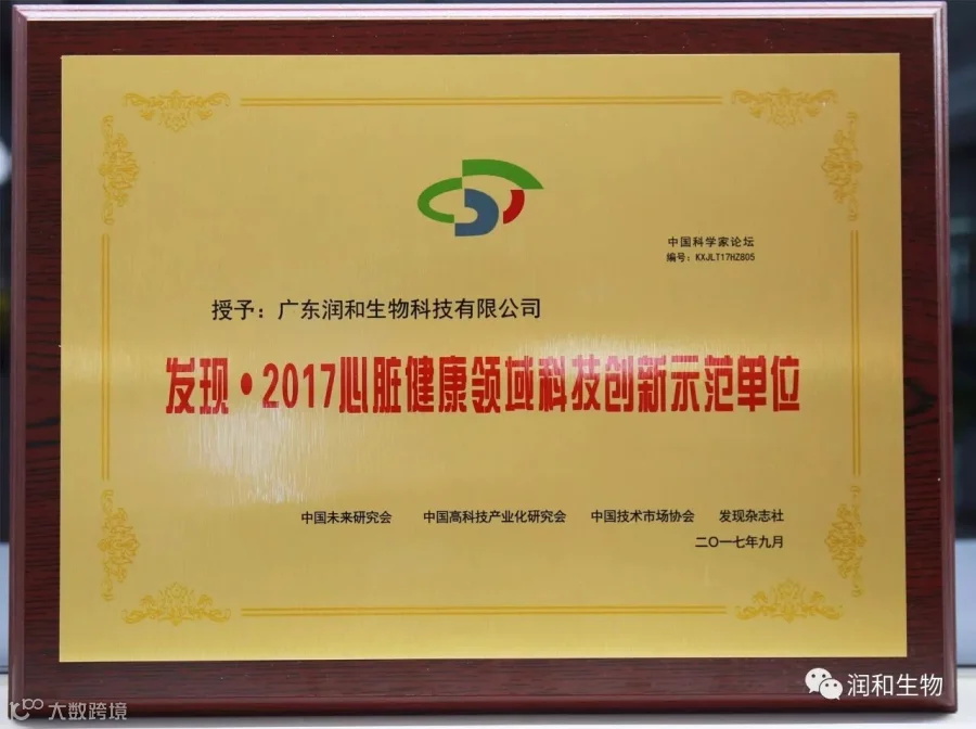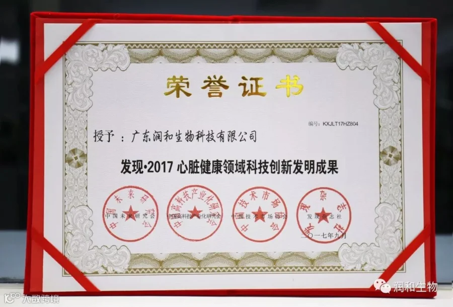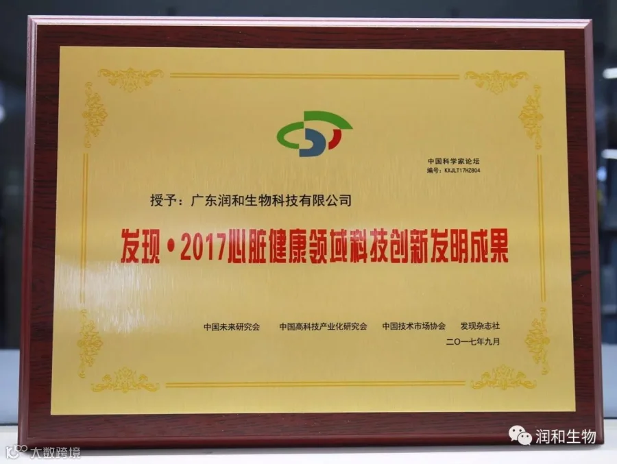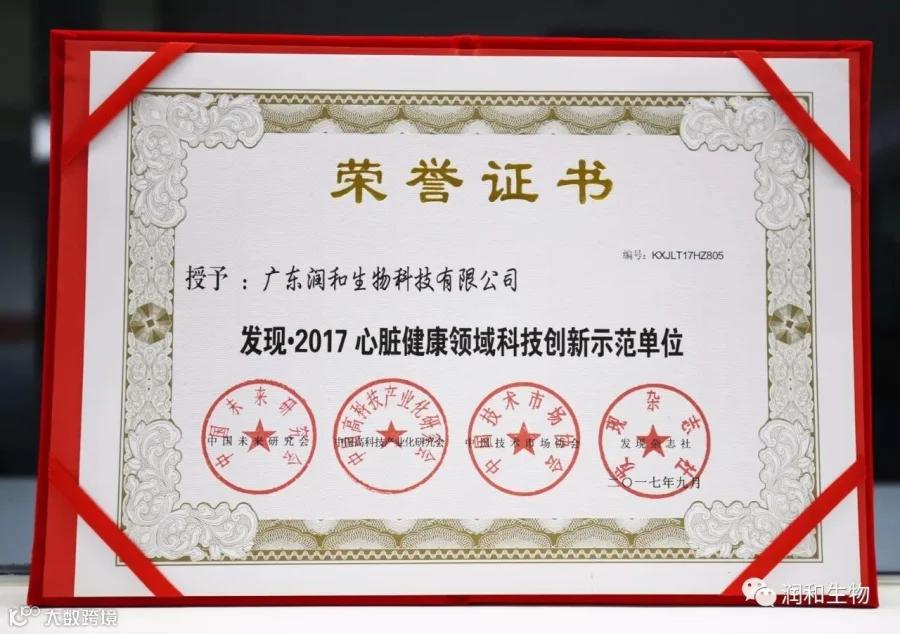 因在科技创新及推进国家创新创业等领域成果显著、贡献突出,广东润和生物科技有限公司继2016年荣获《发现· 2016健康产业科技创新品牌》,董事长唐林志先生荣获《发现· 2016健康产业科技创新领军人物》荣誉后, 2017年9月18日,在第十四届中国科学家论坛上,润和生物再次获得《发现· 2017心脏健康领域科技创新示范单位》、《发现· 2017心脏健康领域创新发明成果》两项殊荣。