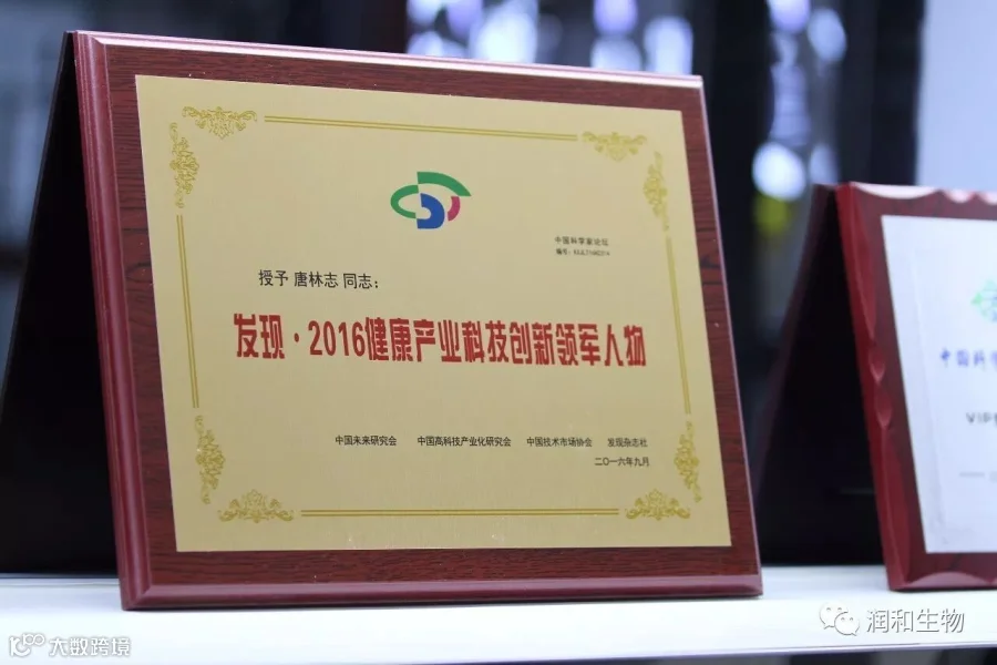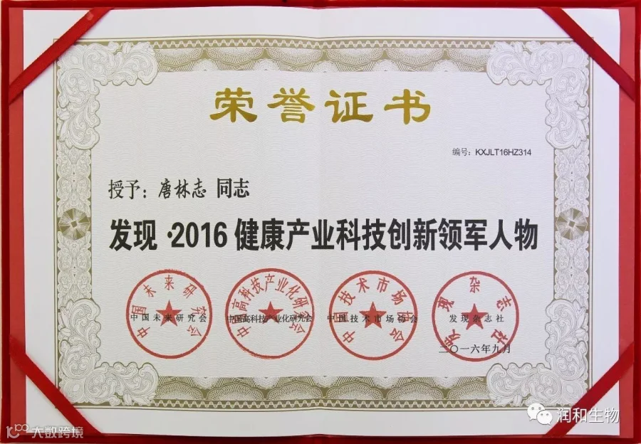 2016年荣获《发现· 2016健康产业科技创新品牌》,董事长唐林志先生荣获《发现· 2016健康产业科技创新领军人物》荣誉。