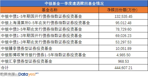 4月7日,中银基金旗下产品的2022年一季报,这是2022年首批基金一季报,其中包括10只债券基金2只货币基金。据Datayes!Pro统计,中银基金8只债基出现了净赎回情况,总数量达到了44.46亿份。