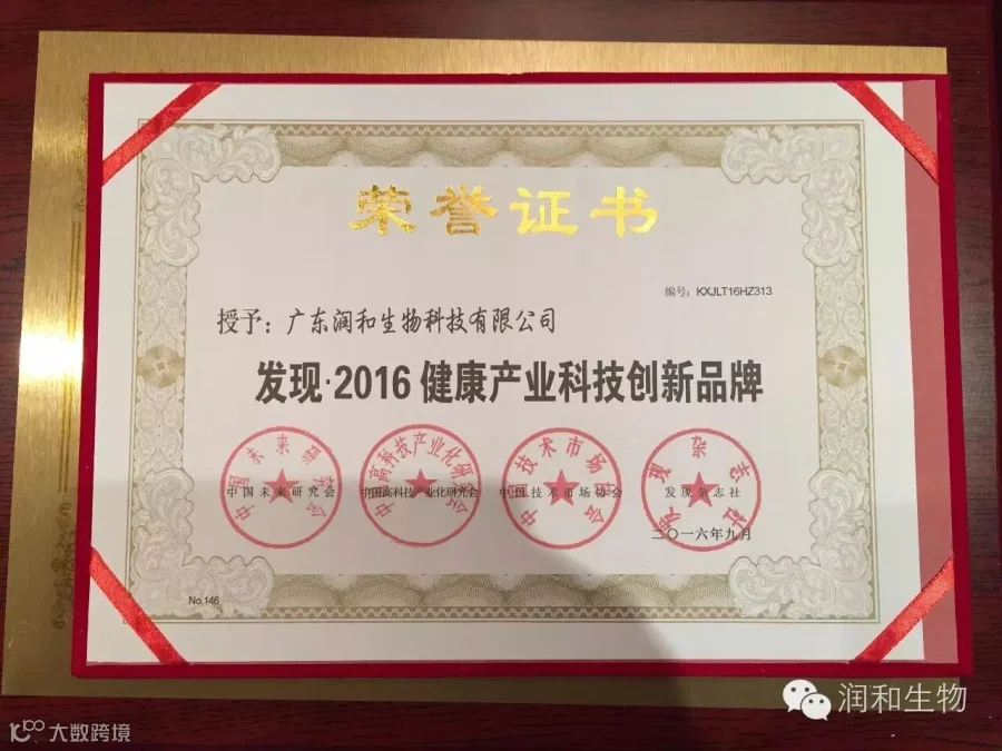 广东润和生物科技有限公司在科技创新、科技成果转化,推进国家创新创业等领域作出的贡献,符合国家创新、协调、绿色、开放、共享的发展理念和活动推选条件与要求,荣获“发现•2016健康产业科技创新品牌”。