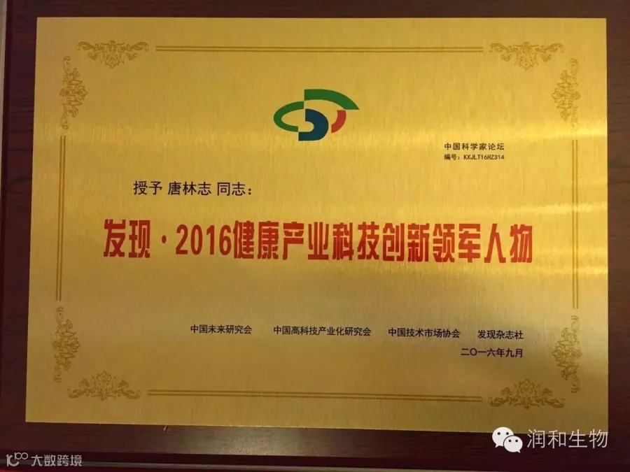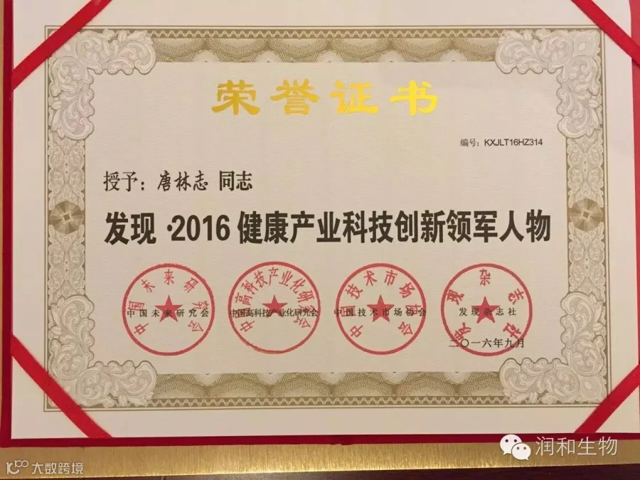 大会评委根据候选人对中国健康产业、科技发展与创新方面所作的突出贡献,以100:1的比例综合评审出“发现·2016健康产业科技创新领军人物”,润和生物董事长唐林志先生获此殊荣。