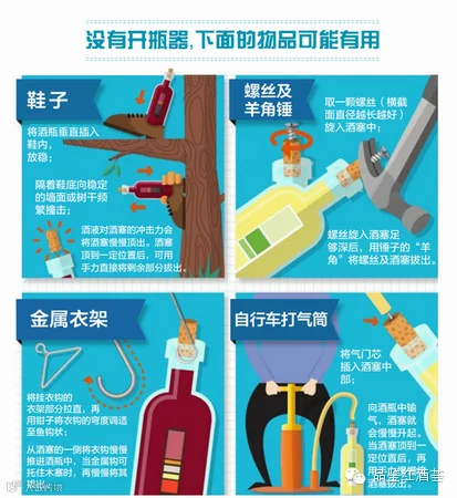 想象这样一个场景:与朋友的聚会上,突然发现没有开瓶器。面对一瓶诱人的葡萄酒,大家你看看我,我看看你。看了又看之后,却还是不知道怎么办。其实,只要用鞋子、羊角锤和螺丝、挂衣钩或自行车打气筒中的任何一个,就可以轻松解决这个问题了。