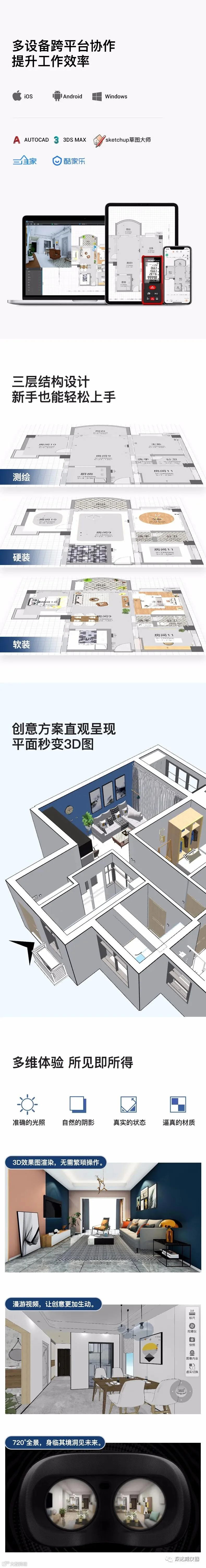独创的量房/硬装/软装三层结构设计,新手也能轻松上手。强大的可视化后期处理,3D效果全景漫游,让设计直观呈现,所见即所得。